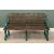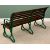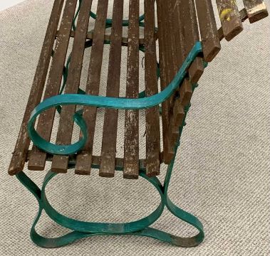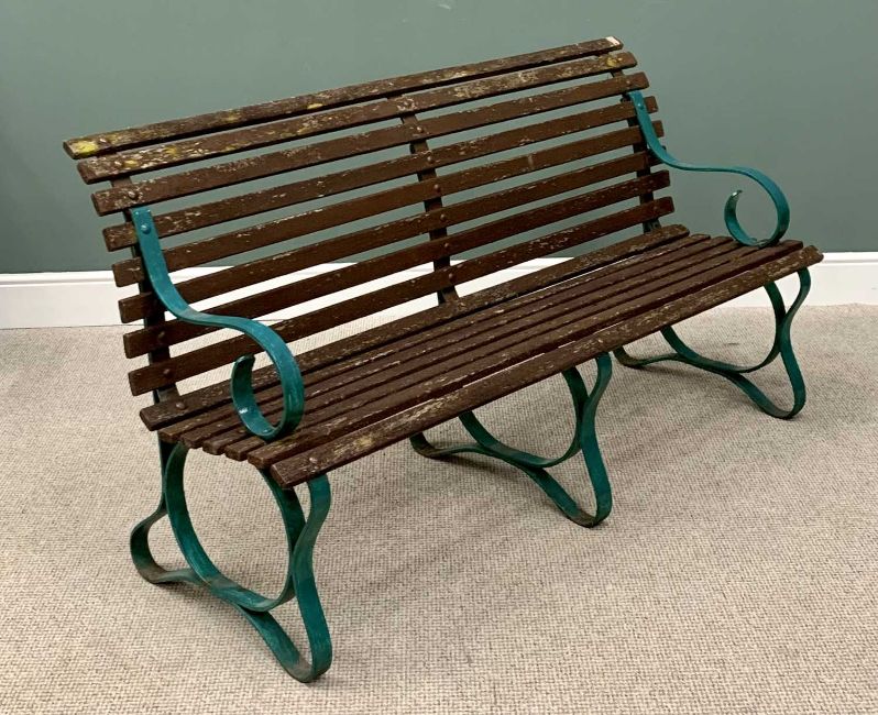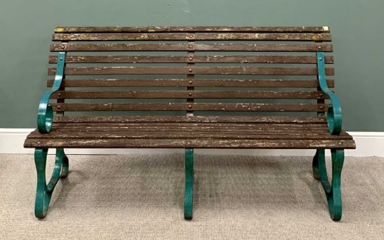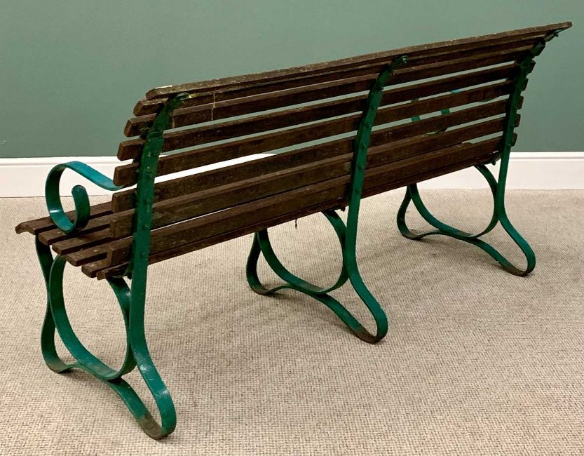 GARDEN BENCH with wooden slats, painted metal scrolled arm supports, 92cms H, 168cms W, 75cms D