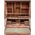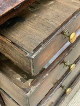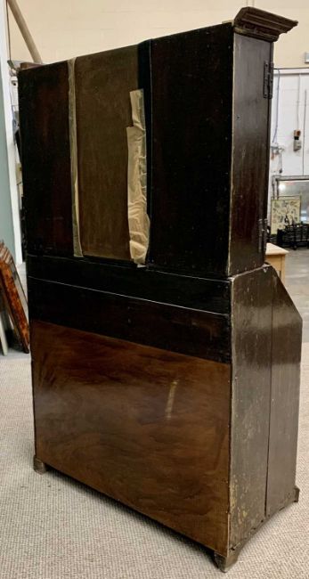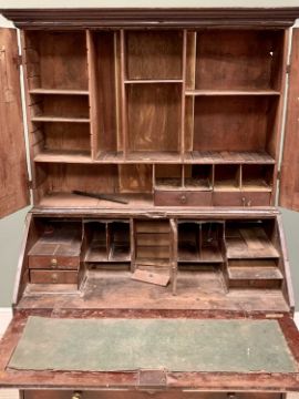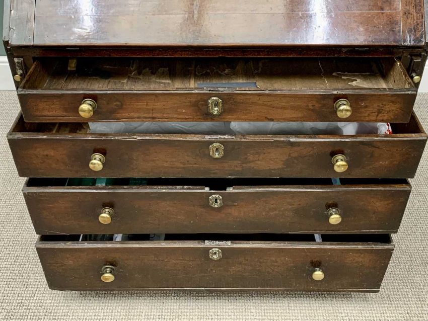 GEORGIAN OAK BUREAU CUPBOARD having a two door upper section with interior shelves, pigeonholes and drawers, a further similar arrangement to the sloped fall interior, above four long opening oak lined drawers on corner bracket feet, 170cms H, 98cms W, 53cms D