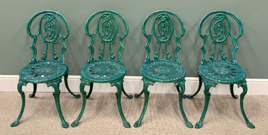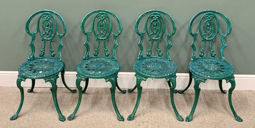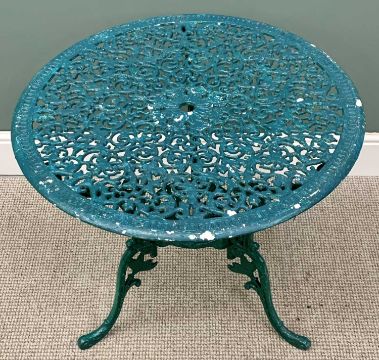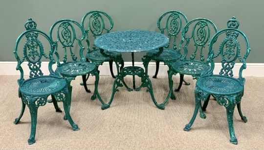 GARDEN FURNITURE - ANTIQUE STYLE GREEN PAINTED METAL, comprising circular table and a set of six similar chairs, the table is 64cms H, 73cms Diameter, the tallest chair is 93cms H