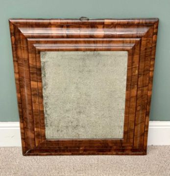 WILLIAM & MARY FIGURED WALNUT CUSHION FRAMED WALL MIRROR late 17th Century, step moulded frame with top hanging ring and probably later bevel edge plate, 81cms H, 69cms W, 7cms D
