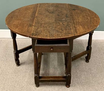 19TH CENTURY OAK GATELEG TABLE circa 1840, with single end drawer, on turned and block supports, 74cms H, 48cms W closed / 114cms W open x 101cms L