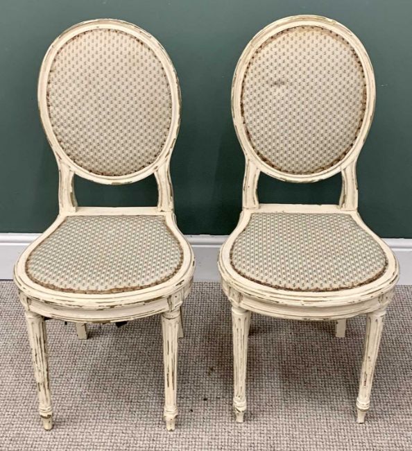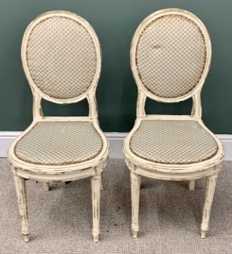 VARIOUS CHAIRS including oak & other farmhouse chairs, vintage folding chair, various measurments, and a pair of French style painted salon chairs, 95cms H, 44cms W, 40cms seat Depth
