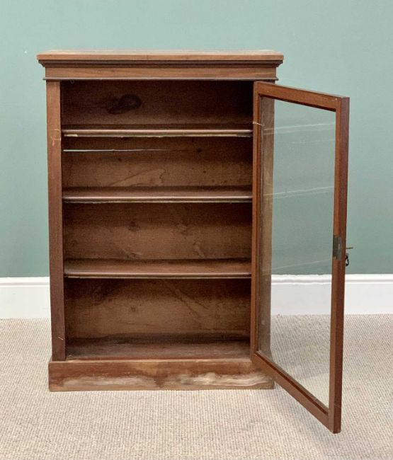 GLAZED SINGLE DOOR VICTORIAN MAHOGANY SIDE CABINET with interior shelves, 109cms H, 76cms W, 31cms D