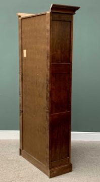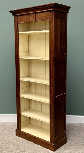 NARROW ANTIQUE-REPRODUCTION WALNUT EFFECT & PAINTED BOOKCASE having a stepped cornice and boarded back with adjustable interior shelves, 222cms H, 95cms W, 42cms D