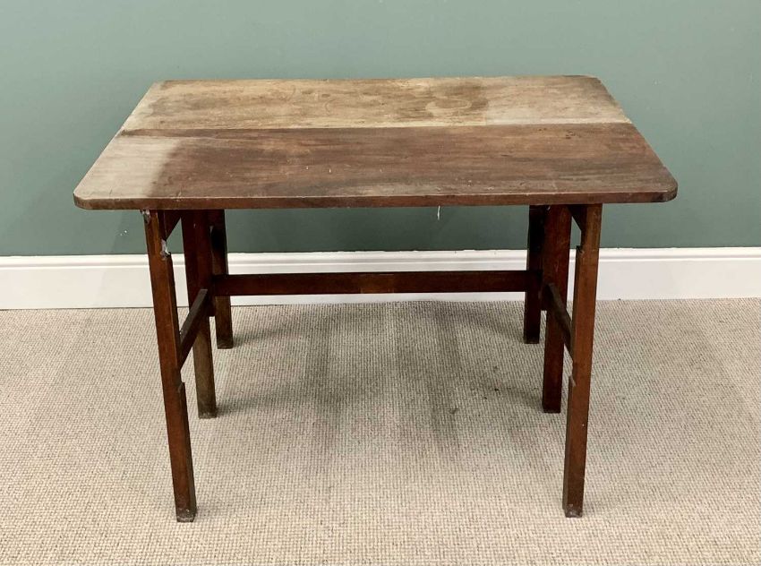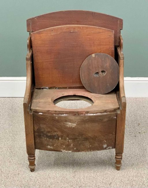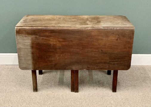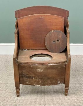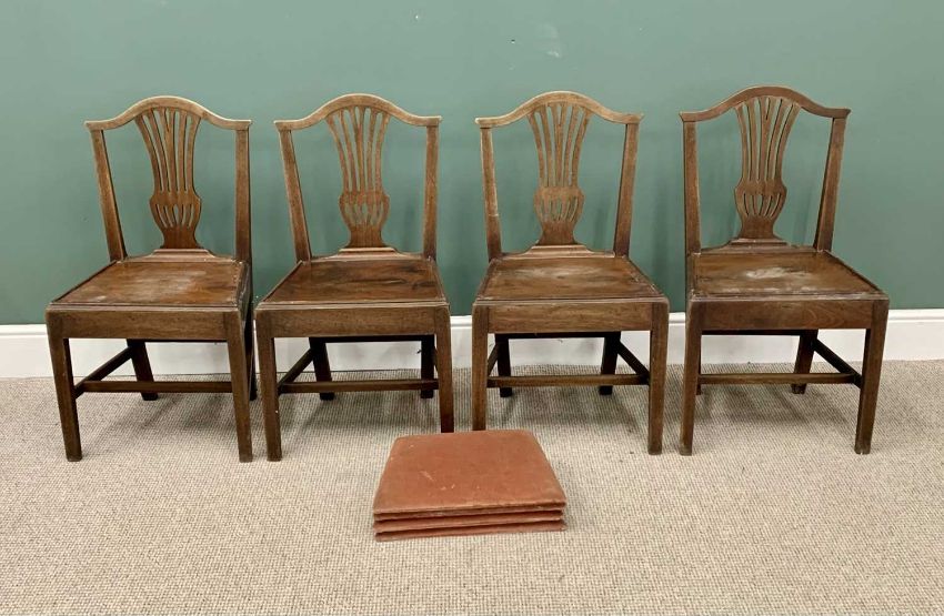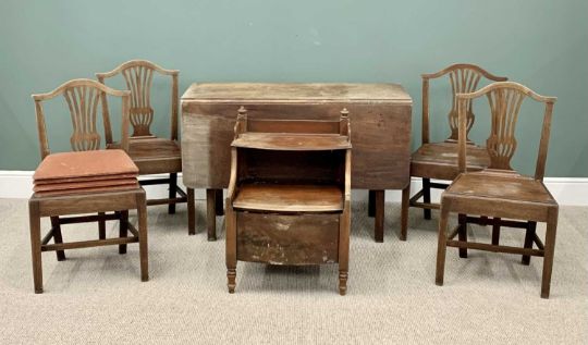 ANTIQUE FURNITURE ASSORTMENT to include mahogany gateleg table, 76cms H, 115cms W, 82cms D (open), Georgian step commode 76cms H, 55cms W, 45cms D and a set of four oak splat back farmhouse chairs, 89cms H, 49cms W, 32cms seat Depth