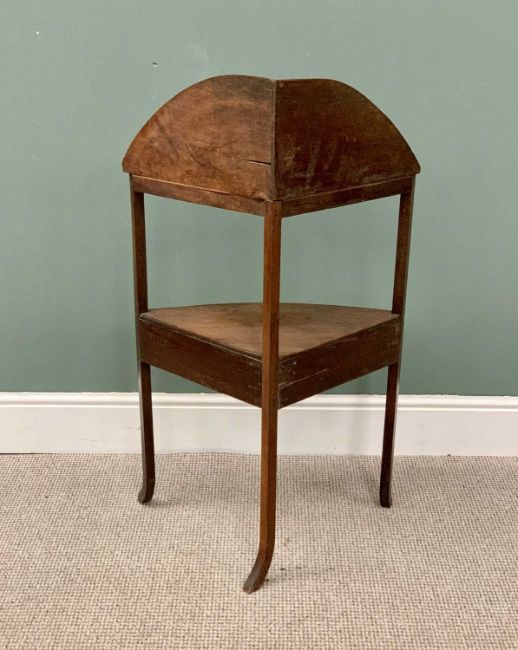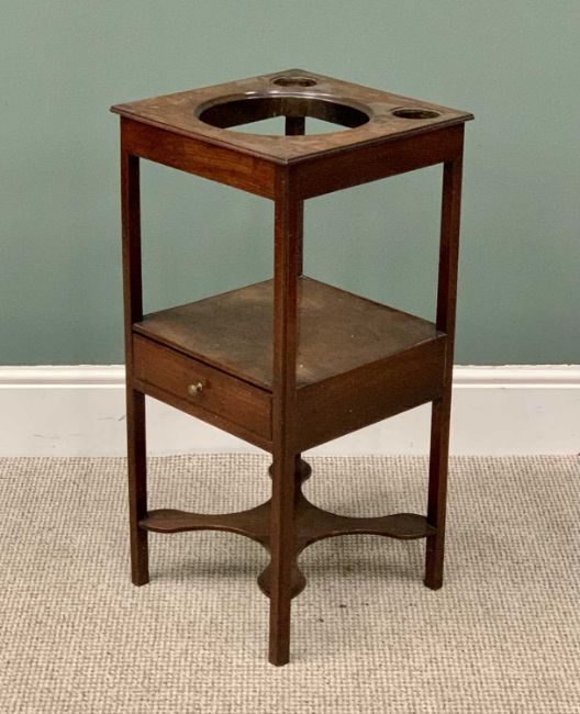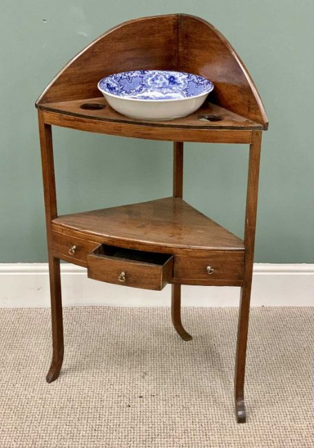 TWO GEORGIAN MAHOGANY WASHSTANDS the taller corner example with splashback and central drawer to a lower shelf, 105cms H, 62cms W, 34cms D the smaller square based stand with single blue and white wash basin