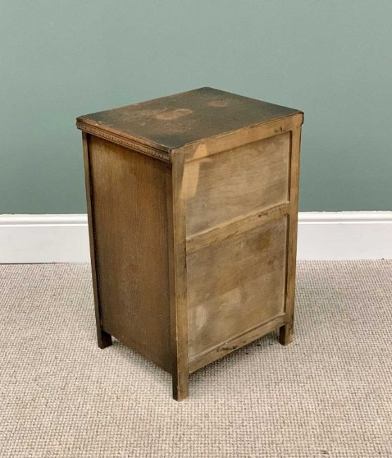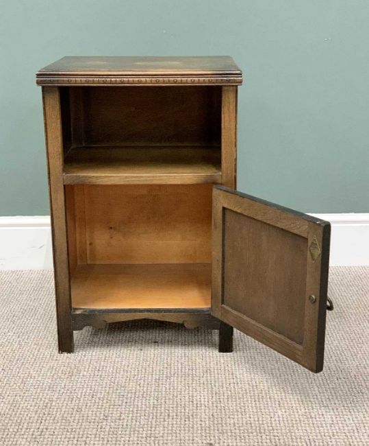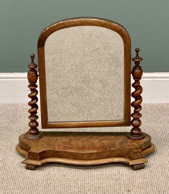 A LINENFOLD NIGHT CABINET & TOILET MIRROR the cabinet with upper shelf and lower cupboard door, 66cms H, 43cms W, 36cms D, the Victorian mahogany dressing table mirror with twist supports, 63cms H, 63cms W, 26cms D