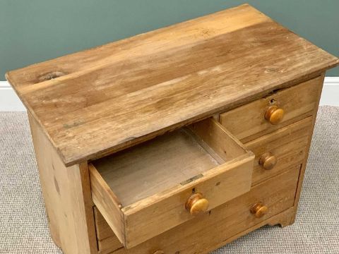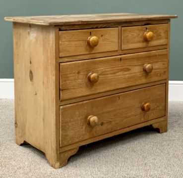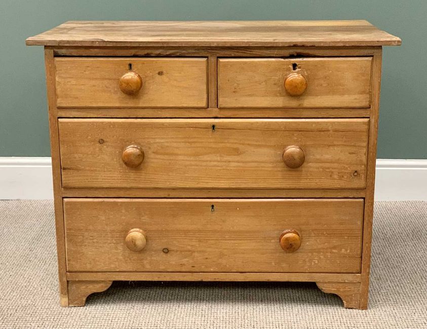 VICTORIAN STRIPPED PINE CHEST OF TWO SHORT OVER TWO LONG DRAWERS, turned wooden knobs on corner bracket feet, 74cms H, 91cms W, 48cms D