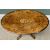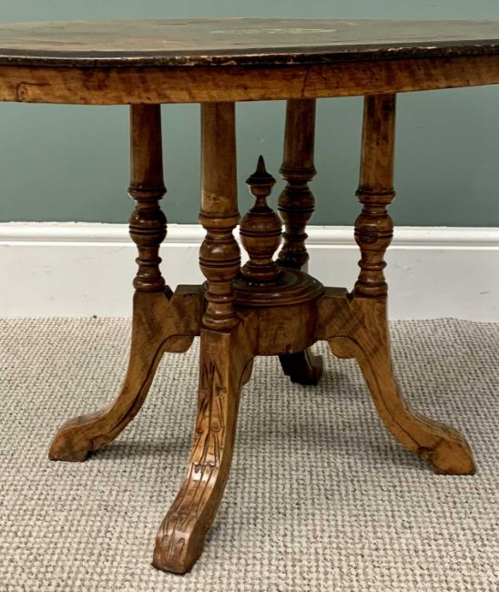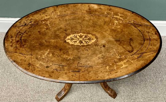 INLAID BURR WALNUT OVAL TOP COFFEE TABLE on a quad column base, 55cms H, 85cms L, 51cms W