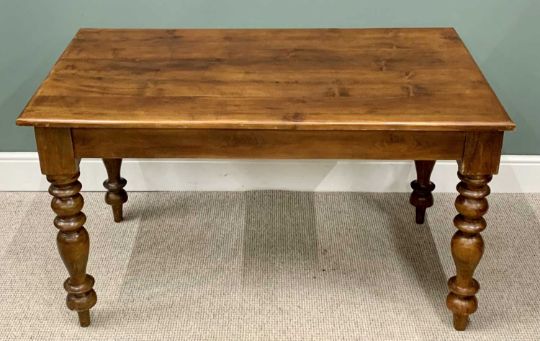 VICTORIAN STYLE PINE KITCHEN TABLE on turned supports, 74cms H, 130cms L, 75cms W