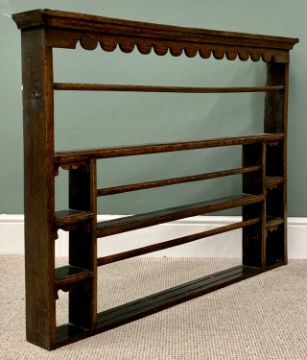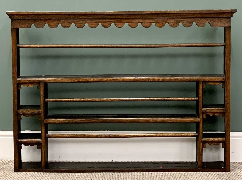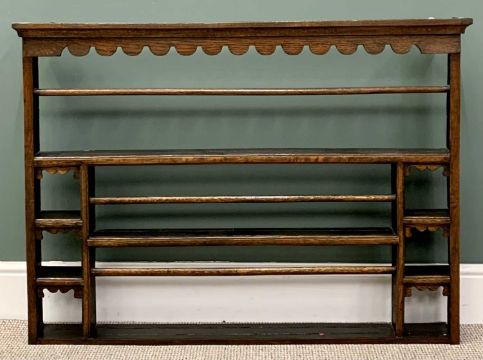GEORGIAN OAK OPEN BACK DELFT RACK with decorative upper front frieze and various size shelves, 86cms H, 118cms W, 12cms D