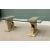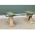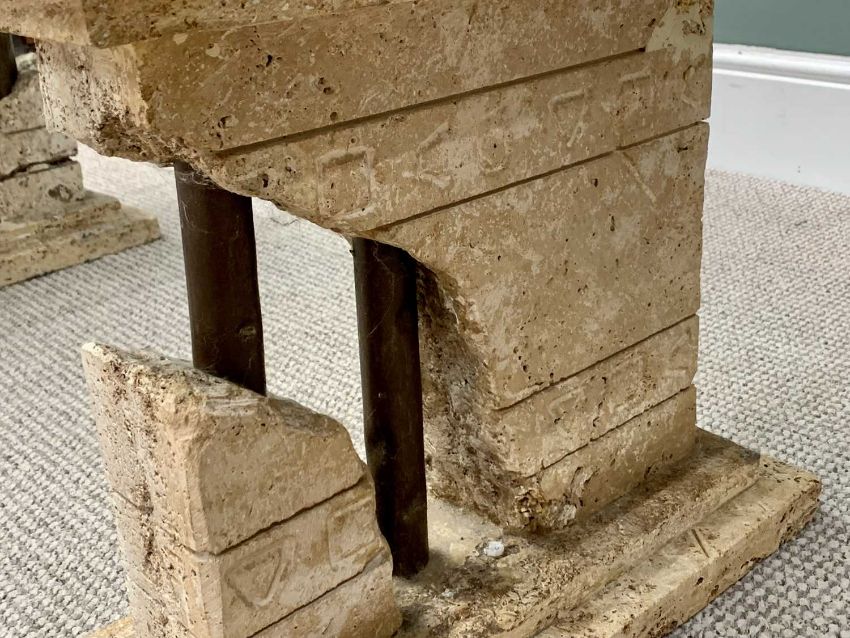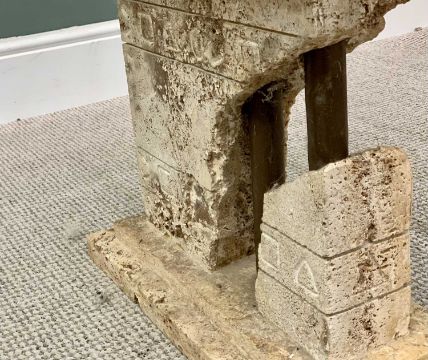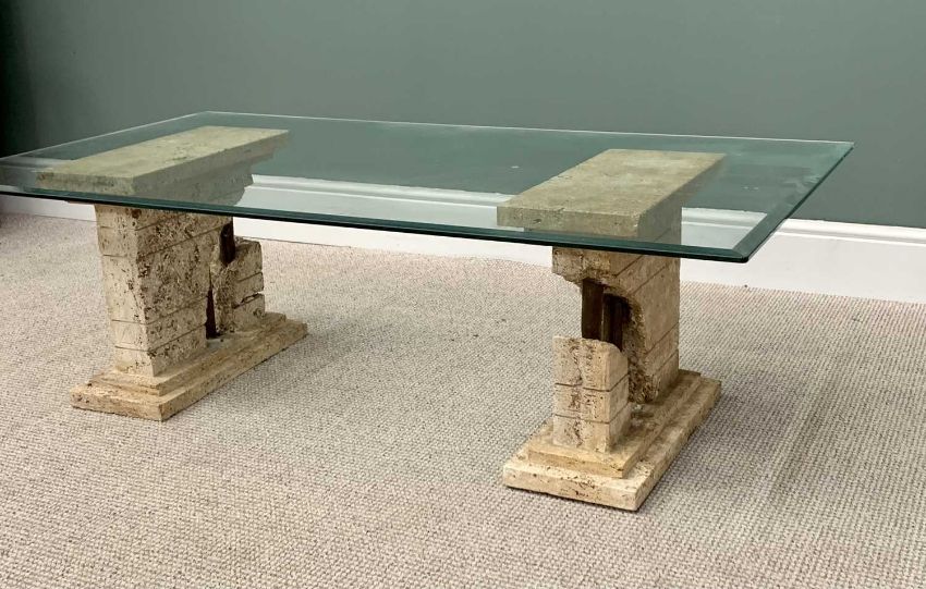STYLISH MODERN COFFEE TABLE having bevelled edge glass top on antiquities-style stoneware plinths, 45cms H, 140cms W, 80cms D