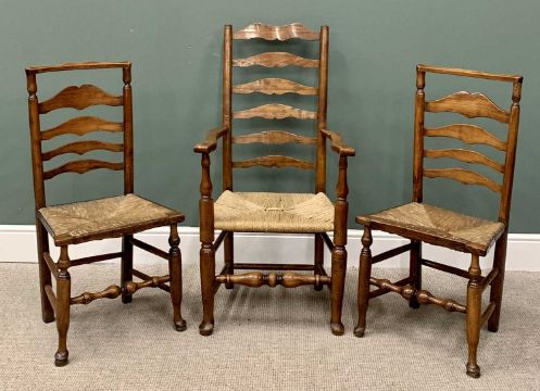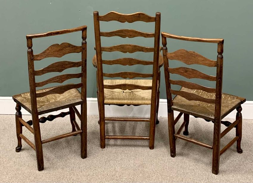 THREE RUSH SEATED LADDERBACK CHAIRS including one carver, on hoof supports, 114cms H, 60cms W, 43cms D and 98cms H, 48cms W, 38cms D