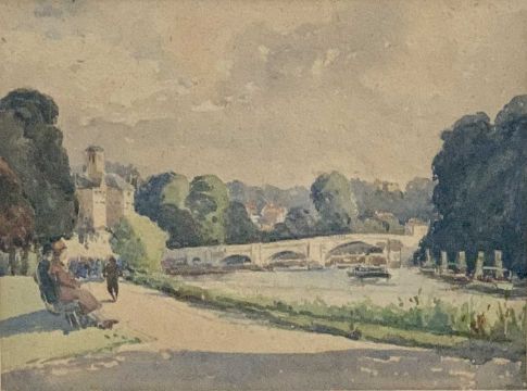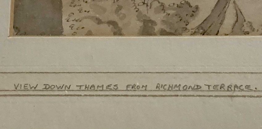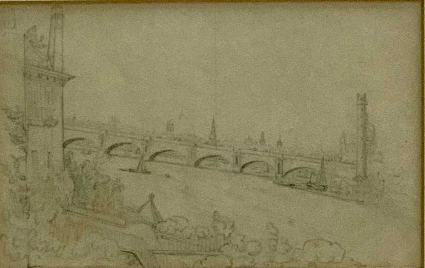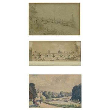 BURRELL (SIR) mixed media on paper - London Thames scenes, 22.5 x 14.5cms and 24.5 x 9.5cms, and an unsigned similar scene watercolour, 27.5 x 21cms
