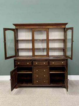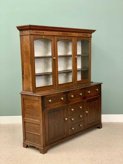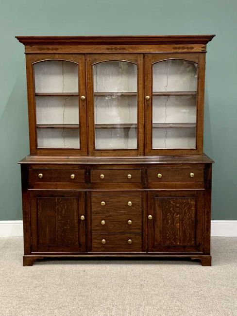 NORTH WALES OAK & GLASS WELSH DRESSER circa 1860, the upper section with glazed arched top doors flanking central glazed panel above a base of three frieze drawers and three blind drawers flanked by twin cupboard doors, 197cms H, 165cms W, 50cms D