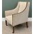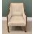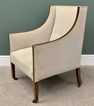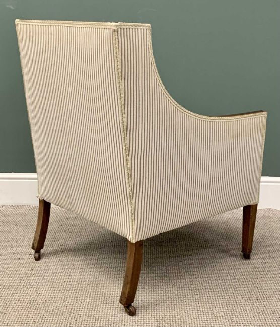 REGENCY-STYLE EDWARDIAN UPHOLSTERED EASY CHAIR in button back striped upholstery, on tapered front supports with brown pot castors, 85cms H, 65cms W, 49cms D