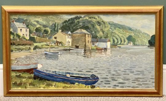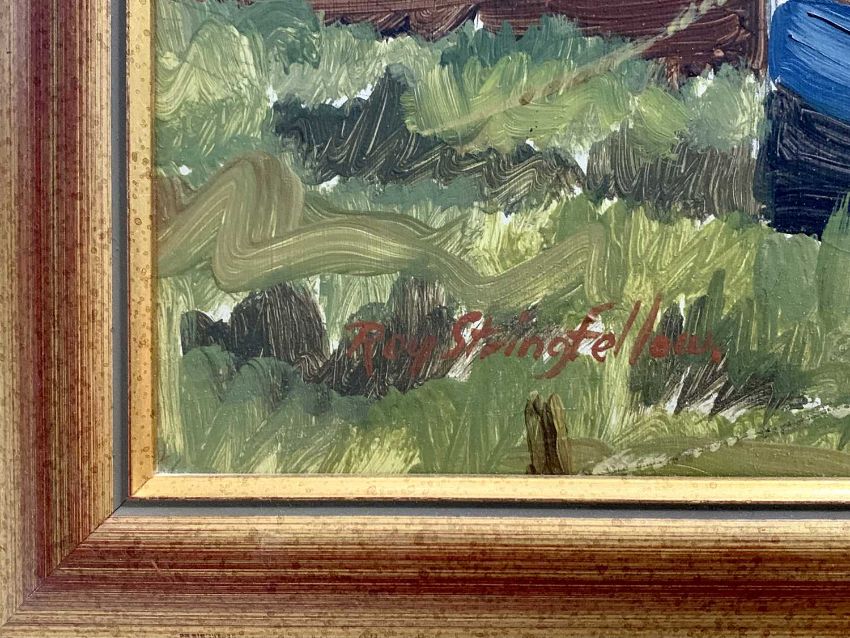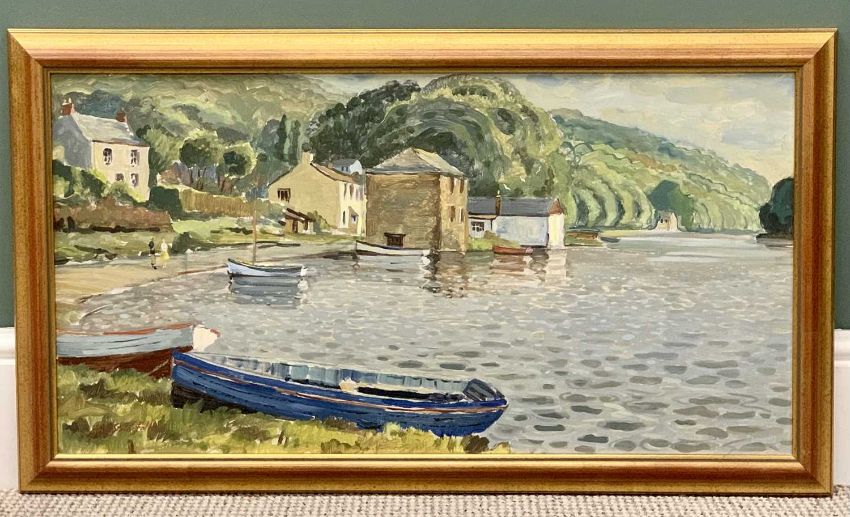 ROY STRINGFELLOW oil on board - buildings and boats at water's edge, signed 38.5 x 74cms