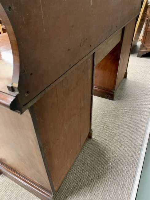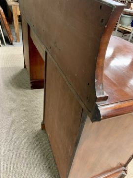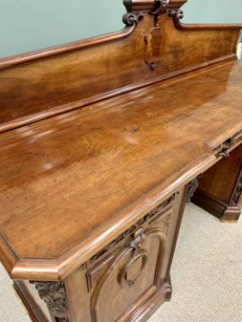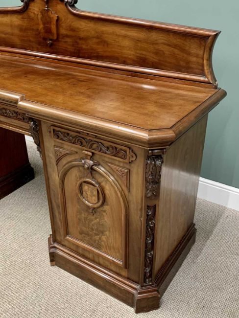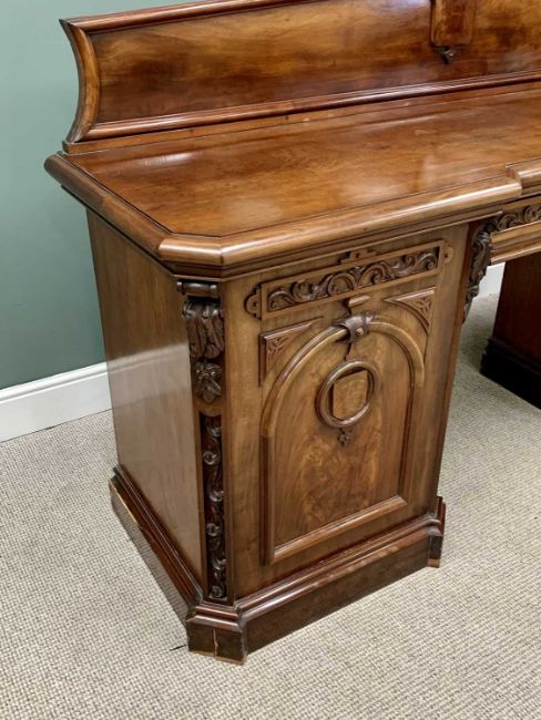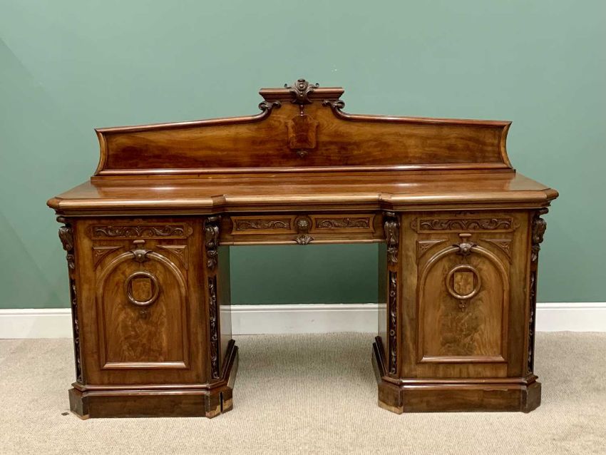 VICTORIAN MAHOGANY PEDESTAL SIDEBOARD having a shaped upper rail-back with carved detail to the crest, leaf swag and shield roundels to the front, central drawer with cupboard door to each of the pedestals on a plinth base with canted corners,145cms H overall, 214cms W, 64cms D