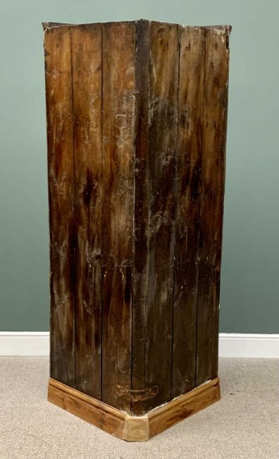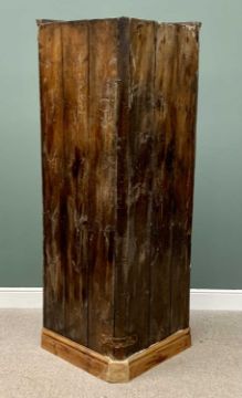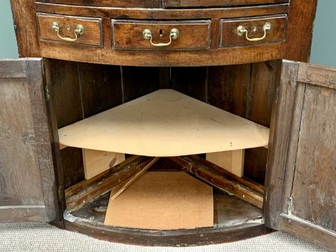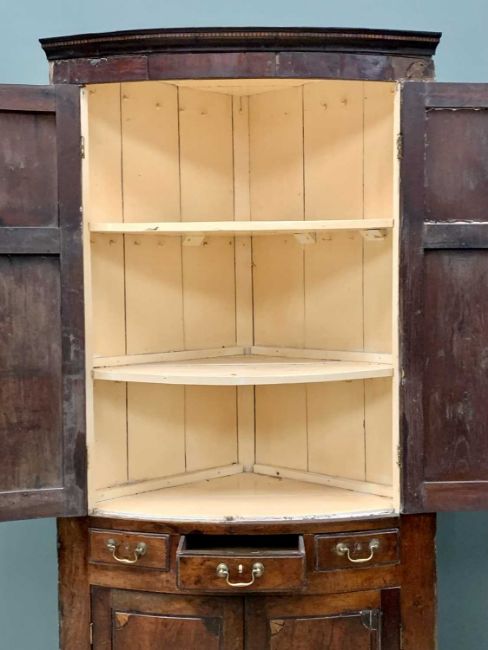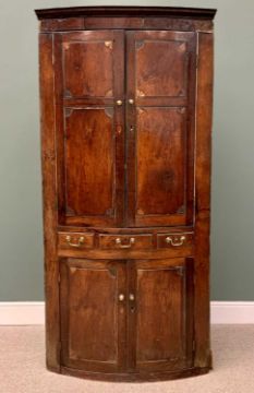 GEORGIAN OAK & MAHOGANY ONE PIECE STANDING CORNER CUPBOARD with bow front upper and lower panelled cupboard doors with three central opening drawers having brass swing handles, 210cms H, 99cms W, 61cms D