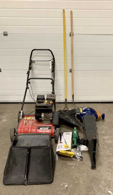ASSORTED GARDEN TOOLS to include a MTD VG40BM petrol lawn scarifier, assorted other tools to include electric weeder, garden blower ETC (E/T)