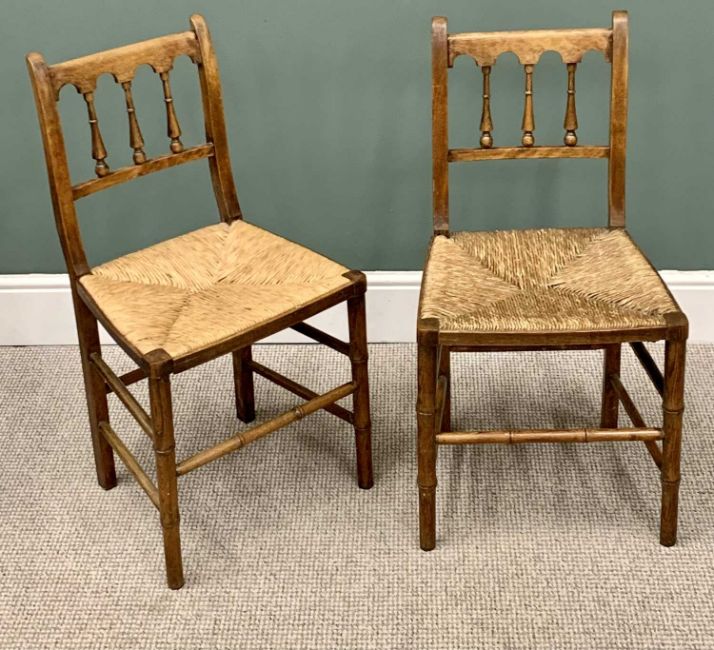 A PAIR OF ANTIQUE RUSH SEATED FARMHOUSE CHAIRS with spindle backs and arched crest rail, 84cms H, 44cms W, 38cms D