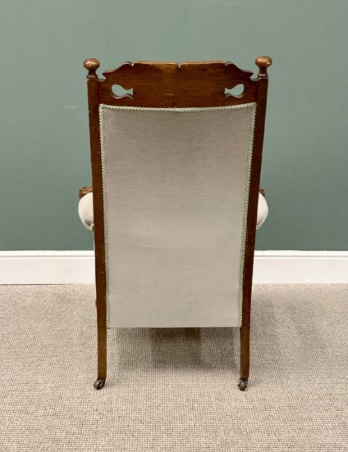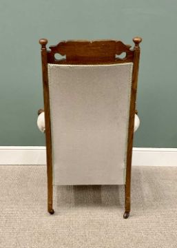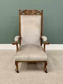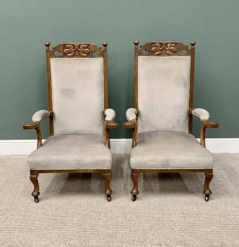 A PAIR OF VINTAGE ARTS & CRAFTS-STYLE OAK UPHOLSTERED ARMCHAIRS having carved leaf detail to the crest rail and to the knurled arm ends, on pad foot front supports and brown pot castors, 117cms H, 76cms W, 58cms D