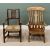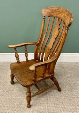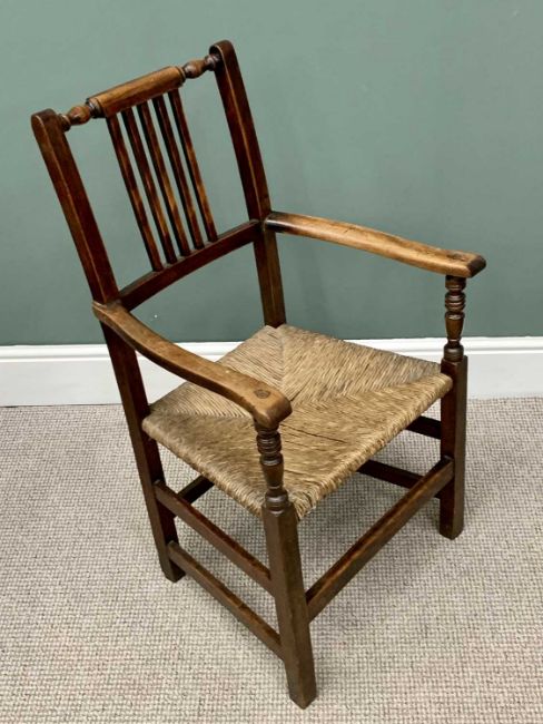 TWO ANTIQUE COUNTRY ARMCHAIRS comprising a solid seat Windsor style chair, 99cms H, 64cms W, 43cms D, rush seated slat back, 96cms H, 57cms W, 40cms D