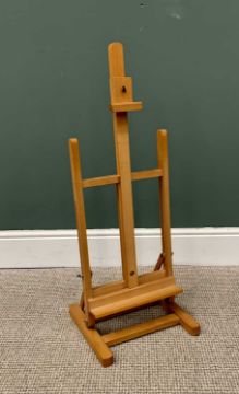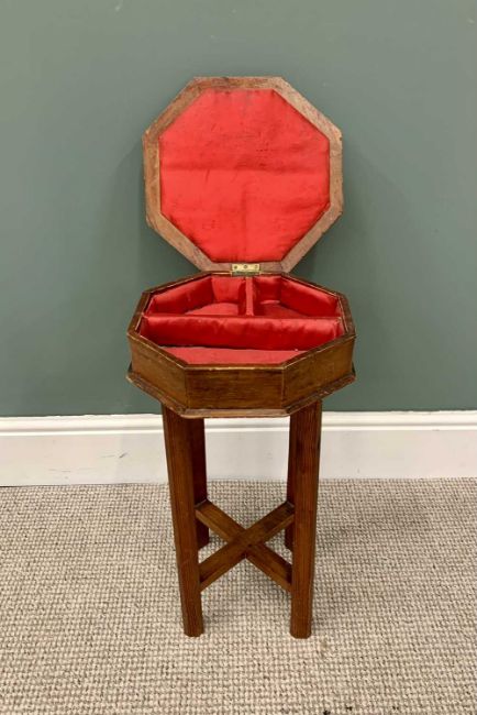 THREE ITEMS FOR THE INTERIOR comprising vintage oak footstool, 26cms H, 36cms W, 22cms D, an octagonal top worktable, 57cms H, 33cms x 33cms top and an artists easel, 88cms H, 34cms W, 31cms D