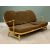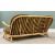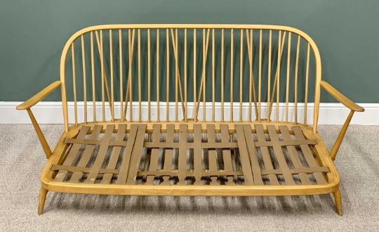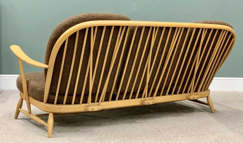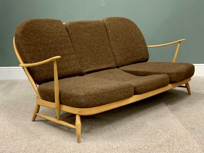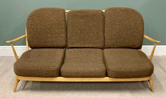 MID-CENTURY ERCOL LIGHTWOOD THREE-SEATER COUCH with spindle back and six cushions, 77cms H, 179cms W, 66cms D