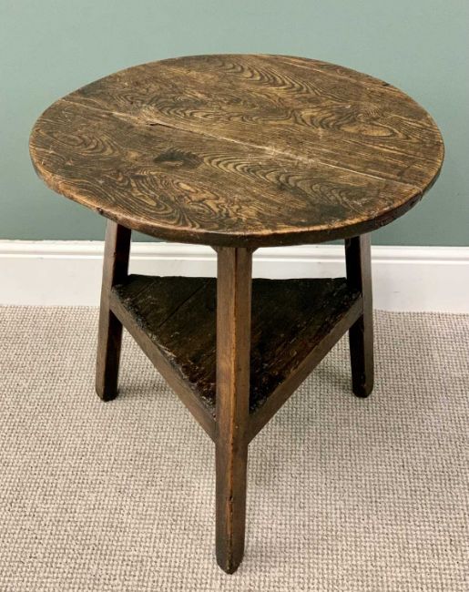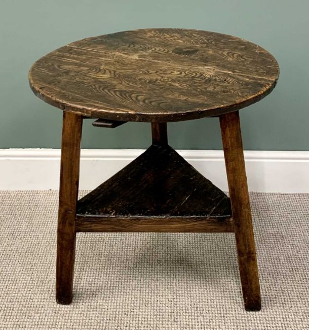 19TH CENTURY STAINED PINE CRICKET TABLE having a triangular lower shelf, 65cms H, 64cms Diameter.