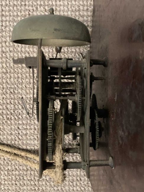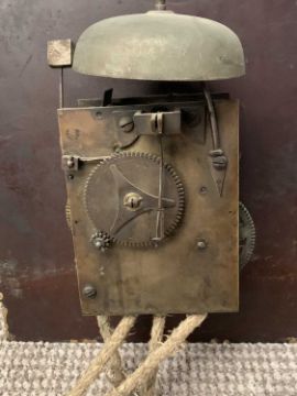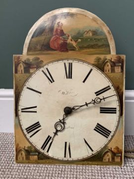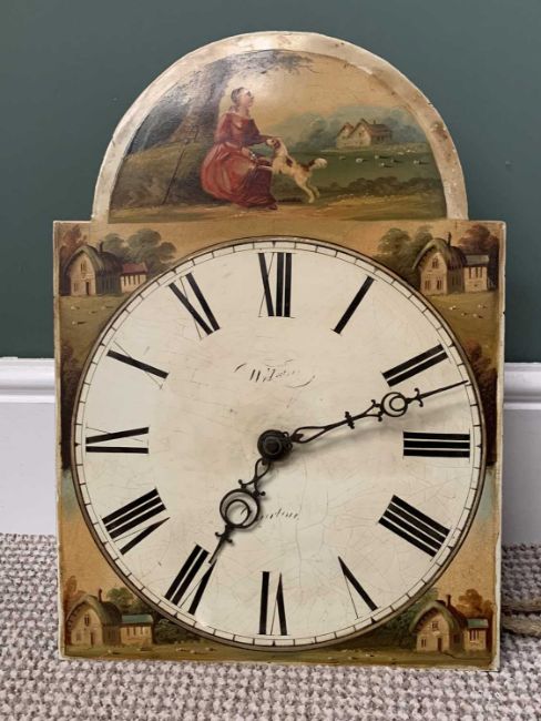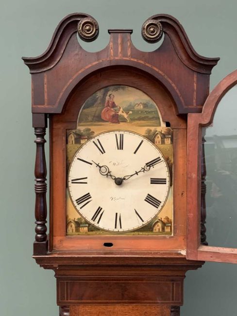 WILSON BARTON PAINTED ARCHED DIAL LONGCASE CLOCK before a single weight pendulum driven bell strike 30-hour movement (pendulum and weight included) in a crossbanded oak and mahogany case with inlay detail, the single glazed door hood with broken swan neck pediment and door flanking turned pillars, shaped trunk door and quarter cut reeded pillar detail to a stepped trunk base, 202cms H overall, 47cms W