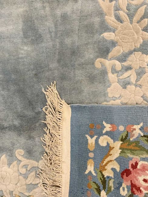 CHINESE WASHED WOOLEN RUG being a large example, blue ground with floral border and central motif, 326 x 235cms