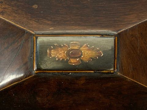 ROSEWOOD DOUBLE TEA CADDY IN SHERATON REVIVAL STYLE, 19th Century of sarcophagus shape with quartered top, the main body painted with urn swags and ribbons, white metal oval ring side handles on gilded paw feet, hinged cover opening to reveal interior fitted twin compartments with lift up lids and a cut glass mixing bowl, 20cms H, 30cms W, 15cms D