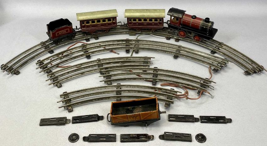 PRE-WAR TIN PLATE TRAIN SET (MATCHED), Johann Distler electric engine train, Karl Bub tender and track, Pullman carriages ETC