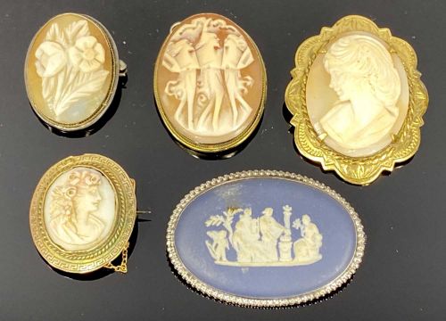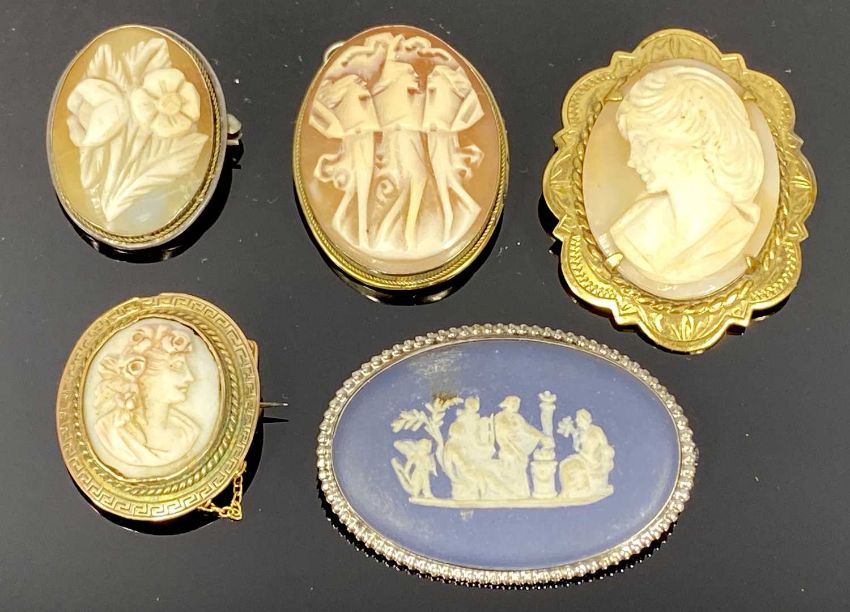 NINE SHELL CARVED CAMEO & OTHER BROOCHES including 3 x with head and shoulder profiles of ladies in gilt metal mounts, 2 x further similar, one mounted in an 800 stamped frame, the other unmounted, 3 x various shell cameos, one detailed with flowers, one of the Three Graces and one depicting a person playing a harp, all with continental silver mounts, also a Wedgwood Jasperware oval brooch with white metal mount, 4.75 x 3.5cms (the largest), the largest gilt metal brooch stamped '2.5m gold plated', 4 x 3.25cms