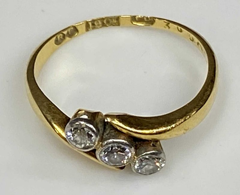 VINTAGE 18CT GOLD THREE-STONE DIAMOND RING the round cut stones individually set to closed mounts, estimated total diamond weight 0.24cts, size N, 2.6g
