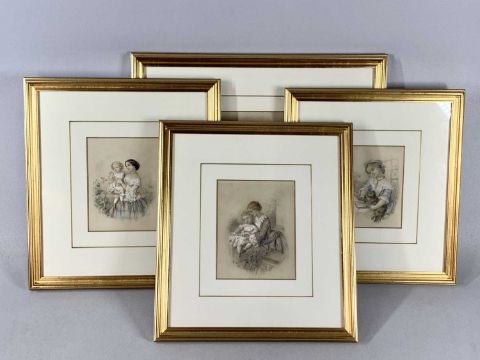 HELOISE LELOIR (nee Colin) (1820-1974) drawings highlighted in watercolour (4) - children dancing, mothers with children and young girl with cat, signed, 17 x 23cms the largest