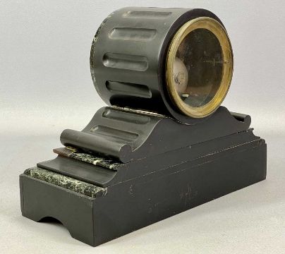 VICTORIAN BLACK SLATE & MARBLE MANTEL CLOCK, barrel movement with white enamel dial and black Roman numerals, 8-day movement striking on a bell, 23.5cms H, 30cms W, 13cms D