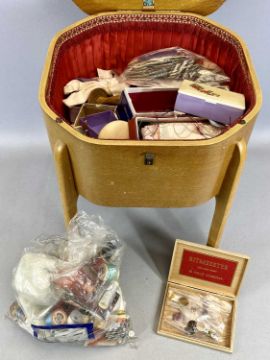 A MORCO PRODUCT LAMINATED OAK SEWING TABLE, shaped circular hinged cover, red silk lined interior, 49cms H, 46cms diam., with contents, and a Cyprus Medium coopered oak barrel round with chrome tap as a wall mounted water feature