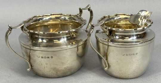 THREE-PIECE SILVER TEA SERVICE, Birmingham 1929, makers marks rubbed, set comprises teapot, 14cms max. H, 26.5cms W, milk jug, 8cms H, 12cms W and sugar basin, 7.5cms H, 14.5cms W, all having crimped upper rims with plain circular bodies, 23.3ozt gross