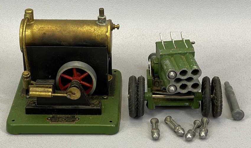 ASTRA 6-BARRELLED ROCKET GUN with rubber wheels, registered no. 854596, in cardboard box with Astra-Pharos label and a Signalling Equipment Ltd model 'Standard no. 1540' steam engine in original cardboard box