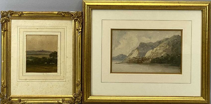 ATTRIBUTED TO PETER DE WINT watercolour - landscape with sheep, bears signature lower left, 14 x 11cms; watercolour - town scene with figures, initialled 'JB'03', watercolour - coastal scene, unsigned, 15 x 25cms and a watercolour - castle beside a river circa 1840, 33 x 23cms