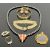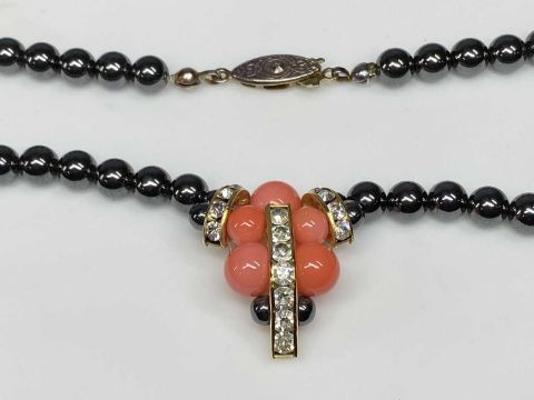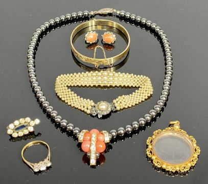 9CT GOLD & OTHER MIXED JEWELLERY GROUP comprising a three-stone 9ct gold and platinum ring, the three round cut stones claw mounted in individual coronets, testing as a central moissanite flanked by two small diamonds, size mid P-O, 2.8g, a gilded possibly 9ct gold (bears marks but difficult to see) circular portrait pendant, vacant with scroll hearts and beadwork detail to the outer rim, 3.5cms diam., 7.4g complete, 9ct rolled gold bangle, chase decorated to one half, 6cms across, simulated pearl bracelet with silver and marcasite clasp, small blue and white paste set brooch, pair of white metal clip on earrings with cabochon possibly coral centres, and a modern hematite-style necklace with paste and pink bead detail to the bottom, 23cms L
