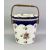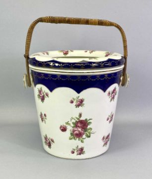 WEDGWOOD & CO IMPERIAL PORCELAIN TOILET SET cream glazed and decorated with roses, the blue border decorated with gilt swags, jug, bowl, slop basin and cover with wicker handle, the jug, 31.5cms H, on wrought metal stand with under-tier and folding towel holder, 104cms H overall