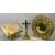 HEAVY BRASS BOOKSTAND ON REVOLVING BASE, 'IHS' inscription stamped Jones & Willis to the front, 22cms H, 28cms W, together with a simple brass cross on a stepped rectangular base,31cms H and an Arts & Crafts-style brass alms dish, 38cms Diameter