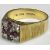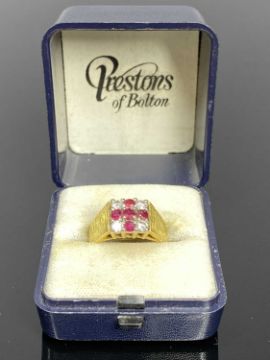 18CT GOLD DIAMOND & RUBY ST. GEORGE'S CROSS DESIGN RING, date marked Birmingham 1975, the square coronet mount set with five rubies in the form of a cross and approx. 0.07ct round cut diamonds to each corner, the wide band shoulders with ribbed detail, size P, 7.6g