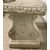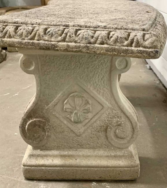 RECONSTITUTED STONEWARE GARDEN BENCH, having a curved upper slab with egg-and-dart edge moulding on twin decorative corbel-type supports, 49.5cms H, 116cms W, 41cms D