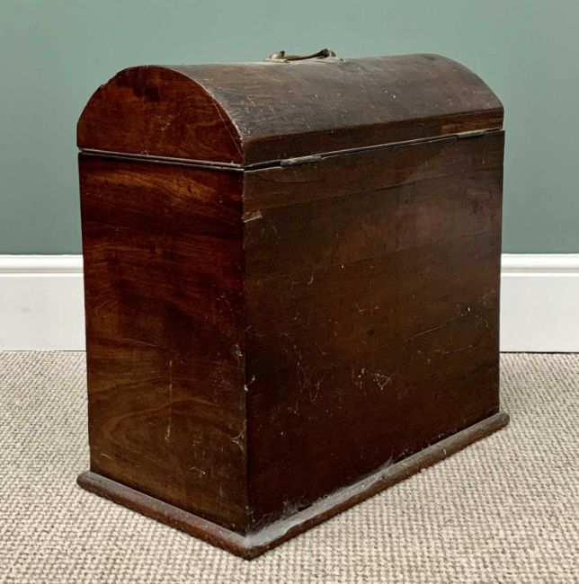 EARLY VICTORIAN MAHOGANY DOMED TOP SILVER BOX with lower front drawer, having brass swing handles to the top and drawer front, interior dividers now lacking, 52.5cms H, 54cms W, 29.5cms D