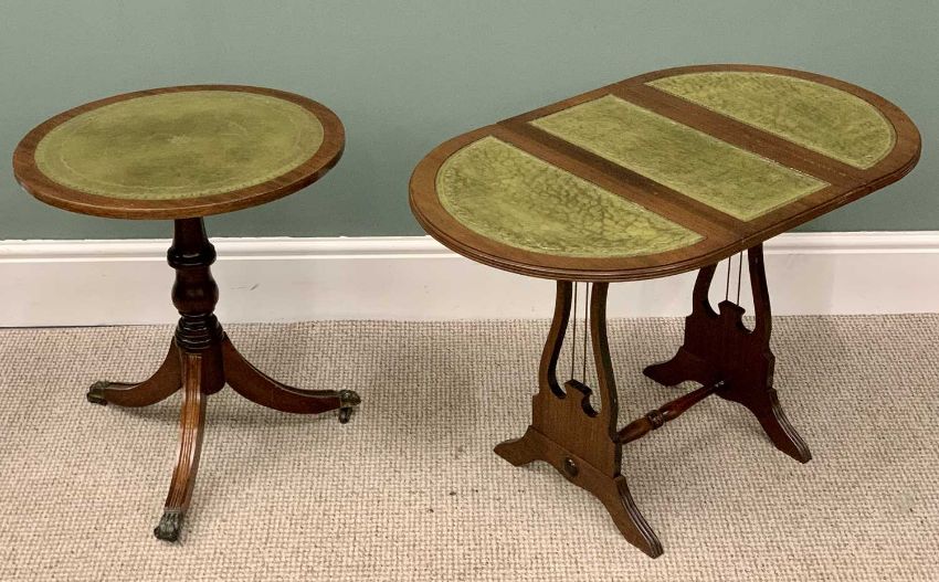 MIXED OCCASIONAL TABLES GROUP x 6, including a mixed woods circular top coffee table with specimen-type detail to the top, 43cms H, 55.5cms diam. top, mahogany circular top coffee table, 46.5cms H, 54cms diam. top, reproduction twin flap swivel top table with gilt tooled green leather inserts and lyre ends, 54cms H, 50cms W, 28.5cms D (closed), similar circular side table on a tripod base, 54cms H, 48cms diam. top and two reproduction wine tables, 51.5cms approx. H