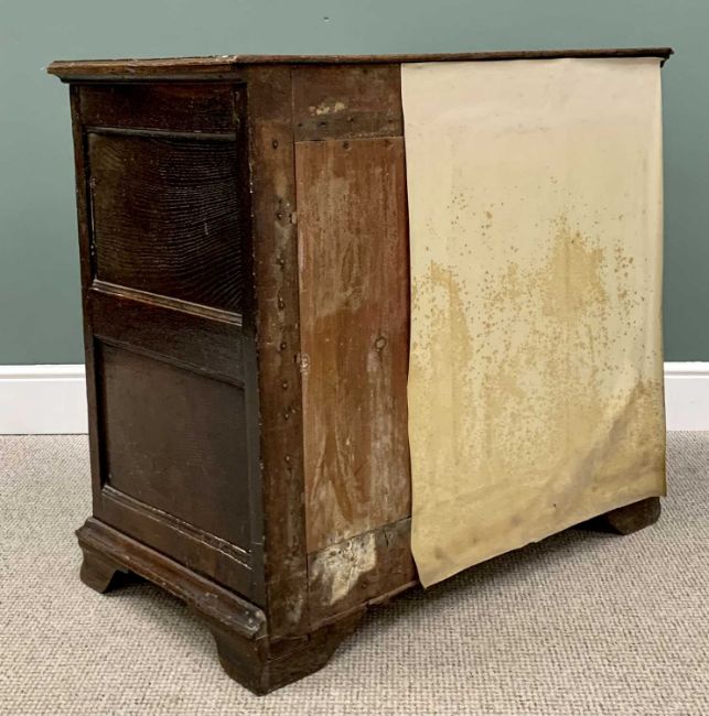 CONTINENTAL OAK JACOBEAN-STYLE CHEST OF FOUR LONG DRAWERS, circa 1900, with brass knobs and applied mouldings, panel sided on corner bracket feet, 89cms H, 97cms W, 55cms D